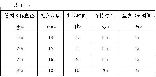 4)從現(xiàn)在開始即進(jìn)入加熱時(shí)間,并加熱至表1中規(guī)定的時(shí)間。規(guī)定的加熱時(shí)間到達(dá)后,從加熱模頭上拔出管材和管件,拔出速度應(yīng)適中,不能過急,但可以略帶輕微的抖動(dòng)動(dòng)作,以利于拔出。
