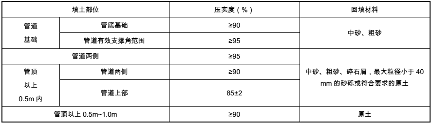 十七、管道管頂 0.5m 以上部位回填土的壓實(shí)度,應(yīng)按相應(yīng)的場(chǎng)地或道路設(shè)計(jì)要求確定,不宜小于90%;管頂 0.5m 以下各部位回填土應(yīng)符合下表的規(guī)定。