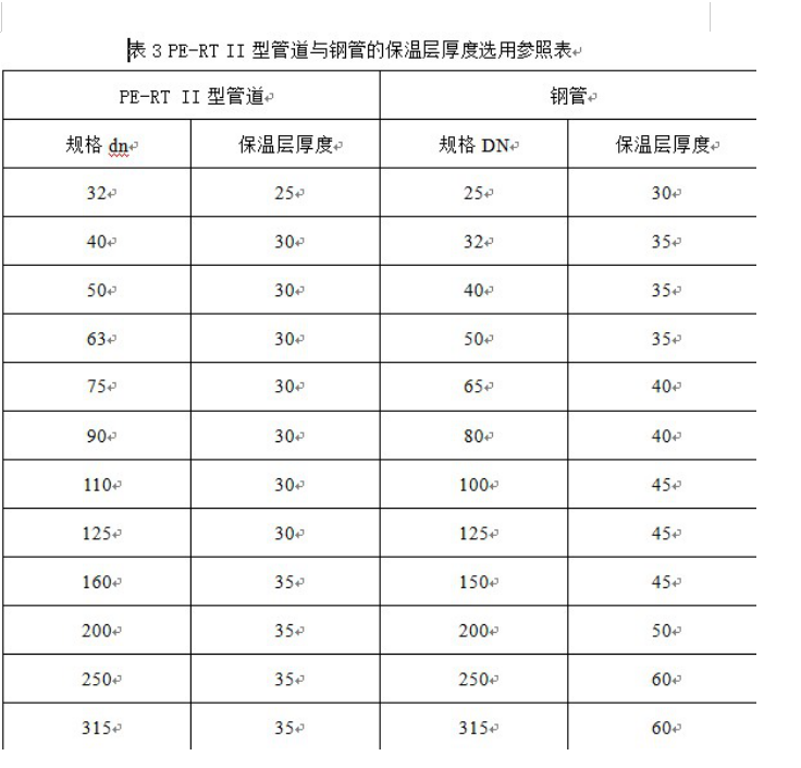 與鋼管比較,PE-RT II型管道的摩擦阻力小,同樣內(nèi)徑的管材流量是鋼管的1.25倍,隨著鋼管的腐蝕,內(nèi)壁會變得更加粗糙,流量也會逐年降低,相同流量的情況下,PE-RT II型管道與鋼管的規(guī)格選型見表2