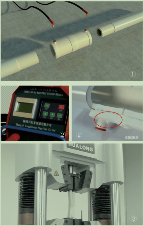 電熔焊接口連接強度高,zui大拉伸力20000N,接口處強度是管材本身的2倍。(圖③)